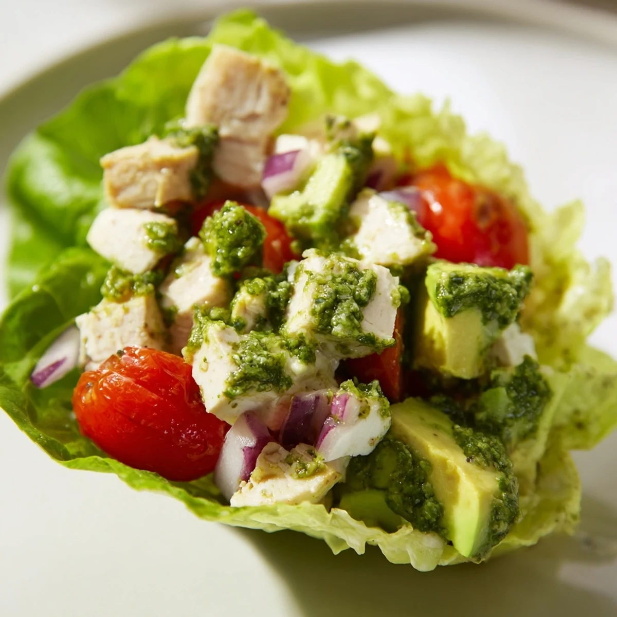 Prepare the chicken mixture and pesto up to 24 hours in advance, storing separately in the refrigerator. Assemble the cups just before serving to keep the lettuce crisp and prevent sogginess.