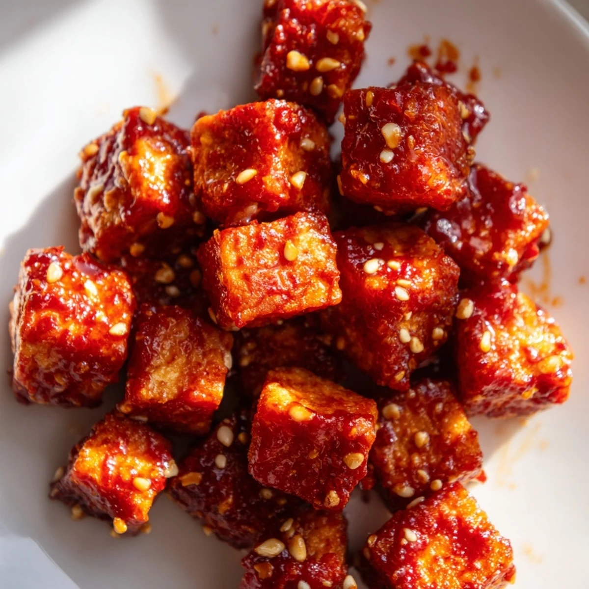- Return your skillet to medium heat and pour in the chili garlic sauce. Let it bubble for 1 minute until slightly thickened, then add the crispy tofu back in. Gently toss until every piece is coated in that gorgeous sticky glaze.