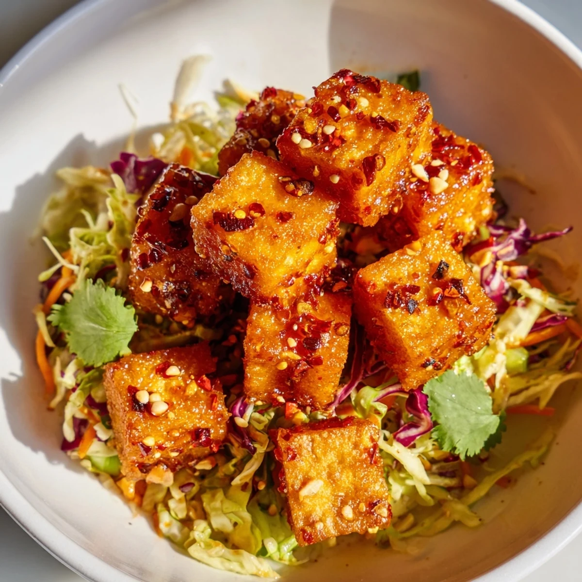 Golden cubes of firm tofu get perfectly crispy in a hot skillet, then are tossed in a bold mixture of chili crisp, soy sauce, and touch of maple sweetness. The spicy, savory tofu balances beautifully against a cool, crunchy slaw featuring both green and red cabbage, sweet julienned carrots, and fresh herbs. A toasted sesame dressing ties everything together with warm, nutty notes while roasted peanuts add satisfying crunch. This dish comes together in under an hour and delivers an incredible contrast of hot and cold, spicy and fresh, crispy and crisp that makes every bite exciting.