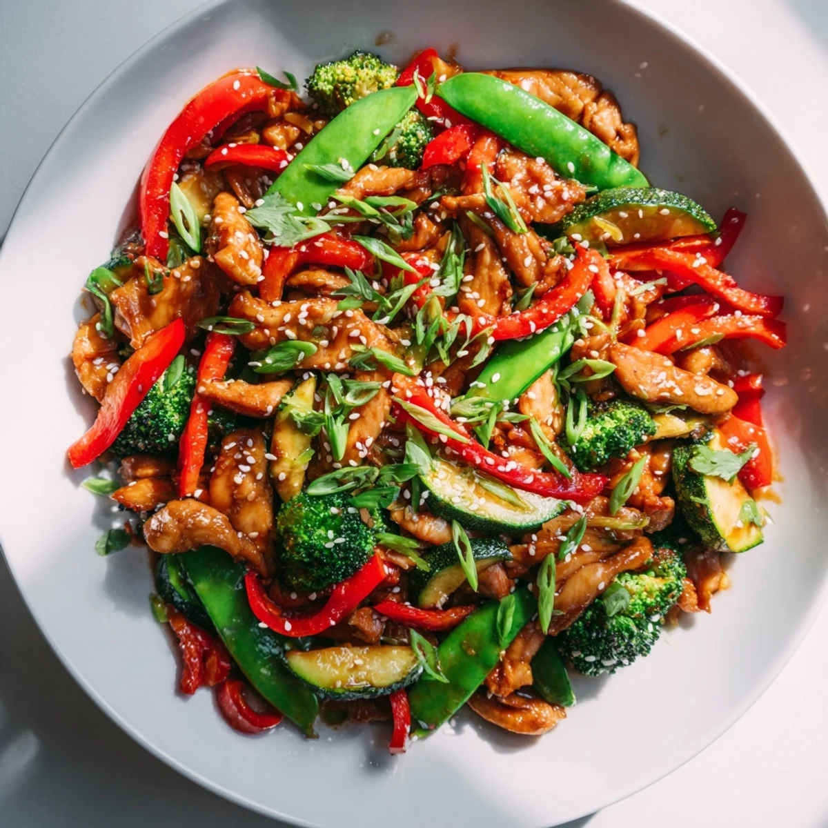 This vibrant low-carb stir fry combines tender chicken breast with a colorful mix of broccoli, bell pepper, zucchini, and snow peas. Quickly cooked with garlic, ginger, and spring onions, it’s tossed in a tangy tamari-based sauce with sesame oil and a touch of heat. Ready in just 30 minutes, it offers a comforting way to energize chilly mornings with fresh, crunchy vegetables and bold flavor. Garnished with toasted sesame seeds and coriander, it’s perfect for a quick, nourishing meal.