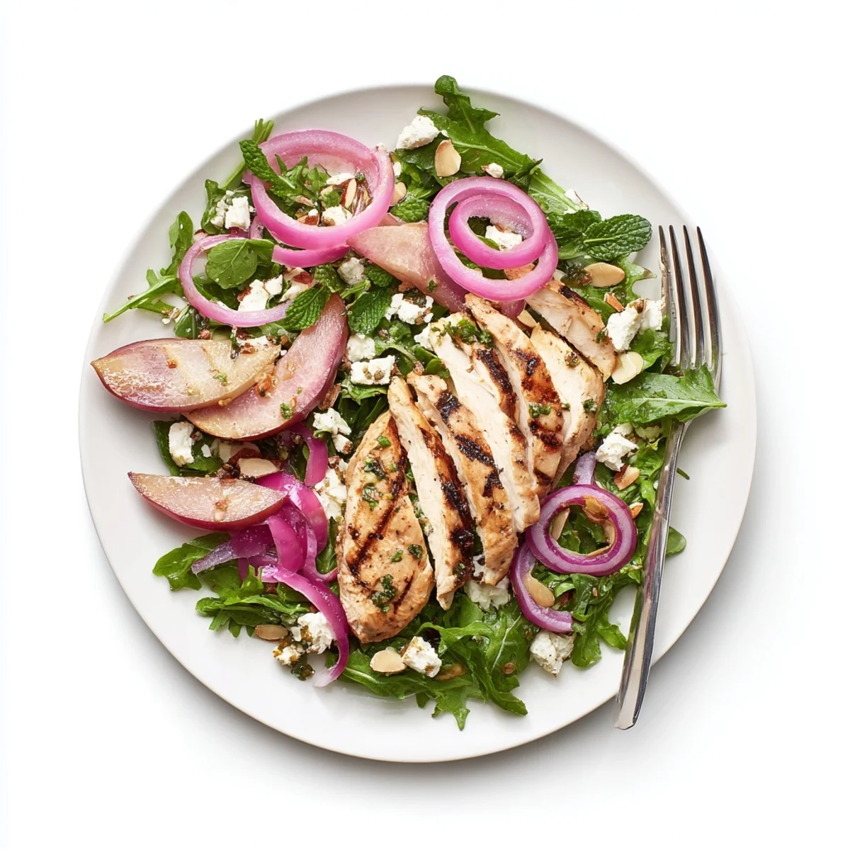 Bright grilled plums and sliced, rested chicken sit atop peppery arugula with crumbled feta and toasted almonds. Grill chicken 5–6 minutes per side until juices run clear; char plum halves 2–3 minutes cut-side down to caramelize. Whisk lemon, olive oil, honey, Dijon and chopped mint into a quick vinaigrette; toss gently and serve immediately for a light, summery main.
