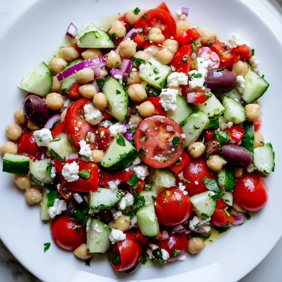 This vibrant Mediterranean bowl combines protein-rich chickpeas with juicy cherry tomatoes, crisp cucumber, red onion, and bell pepper. A bright olive oil and lemon dressing infused with garlic and oregano ties everything together. Add crumbled feta or Kalamata olives for extra depth. Ready in just 15 minutes with no cooking required—perfect for meal prep, summer gatherings, or a satisfying light lunch.