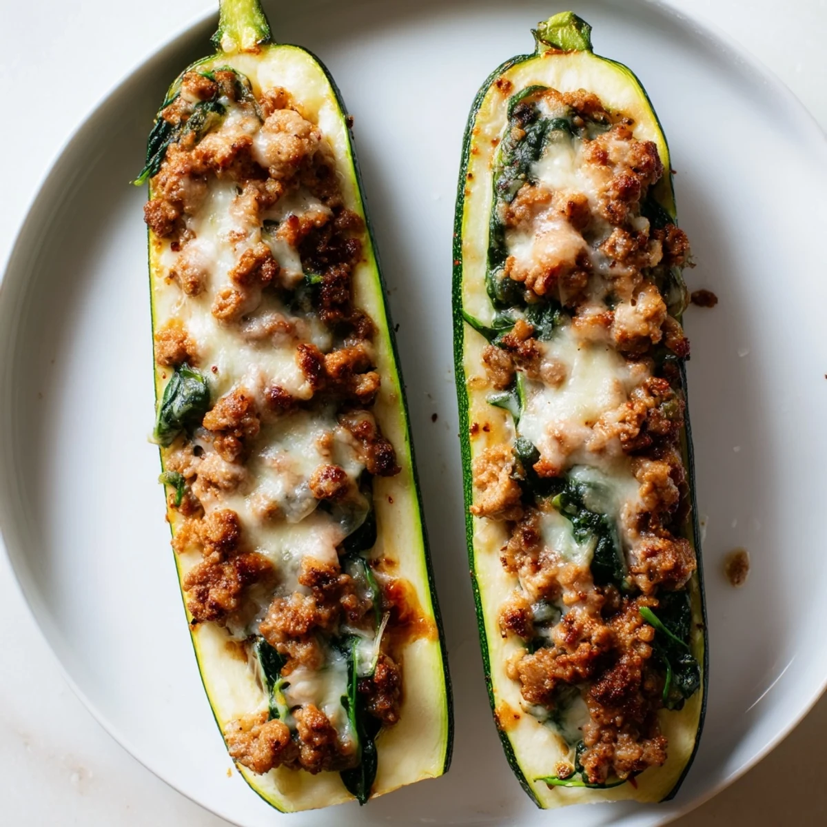 Halve and hollow 4 medium zucchinis, reserving the flesh. Sauté 1 small chopped onion and 2 cloves garlic in 1 tbsp olive oil, add 1 lb ground turkey and brown. Stir in chopped zucchini flesh, 2 cups spinach, then 1/3 cup basil pesto and seasonings. Fill shells, sprinkle 1/2 cup mozzarella and 1/4 cup Parmesan, cover and bake at 400°F for 20 minutes, uncover and bake 5–10 minutes until cheese is golden. Let rest briefly before serving.
