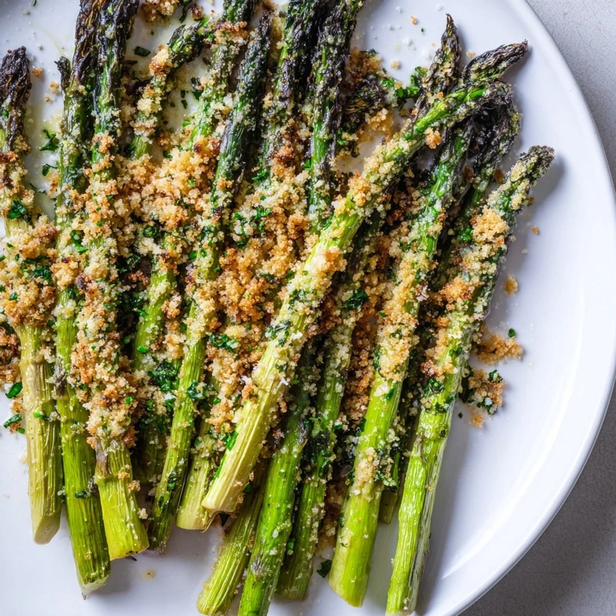 Tender asparagus spears are tossed with olive oil, salt and pepper, then roasted at 425°F until crisp-tender. A skillet crunch is made by melting butter, sautéing garlic briefly, then toasting fresh breadcrumbs until golden and stirring in parsley, chives, thyme and lemon zest. Spoon the warm garlic-herb crunch over the asparagus and serve immediately; a sprinkle of grated cheese is optional.