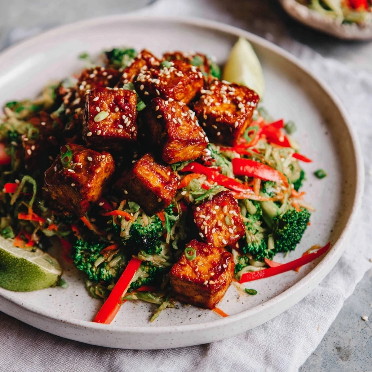 Press extra-firm tofu and cut into cubes, then coat lightly with cornstarch and a pinch of salt. Bake or air-fry until golden and crisp, then toss hot with a chili-lime glaze of soy, chili sauce, lime and a touch of maple. Shred broccoli stems with carrots and bell pepper, toss with a sesame-lime dressing made from toasted sesame oil, rice vinegar, soy, ginger and garlic, and serve the glazed tofu over the crunchy slaw with sesame seeds and cilantro.