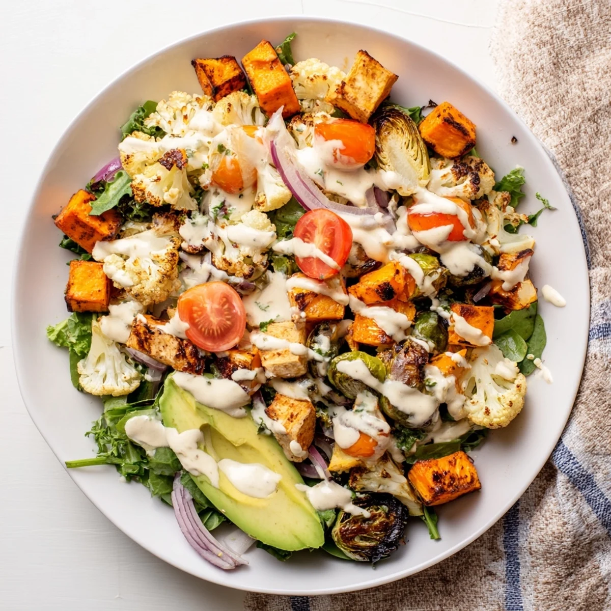 - Top with avocado slices and drizzle the lemon-tahini dressing generously over everything. Serve immediately while the vegetables are still warm.