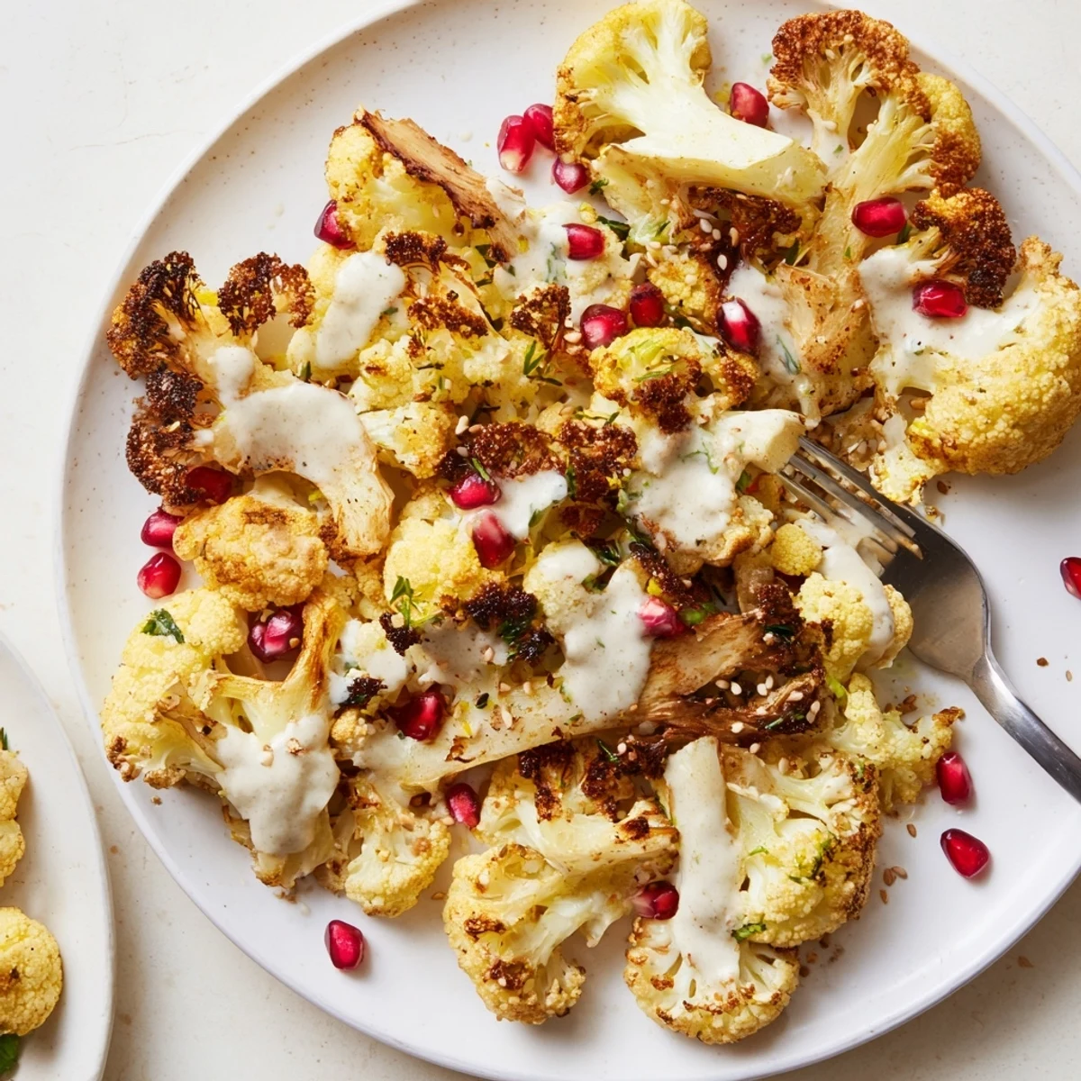Roast cauliflower florets at 425°F until caramelized and tender (about 25–30 minutes). Whisk tahini with lemon juice, garlic, water, chopped herbs and cumin to a pourable consistency. Drizzle over warm cauliflower and finish with pomegranate seeds and toasted sesame. Serves 4; works as a side or piled on flatbreads with chickpeas for a hearty main.